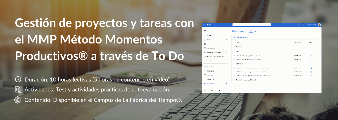 Durante el contenido, el/la alumno/a aprenderá a poner en marcha su propio sistema de trabajo a través del MMP Método Momentos Productivos® definido por La Fábrica del Tiempo, y su implementación con una de las herramientas más utilizadas en Microsoft 365: To Do.